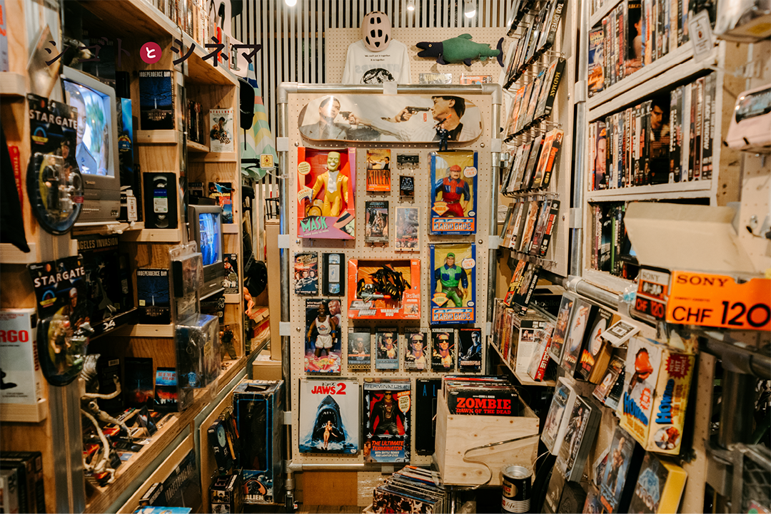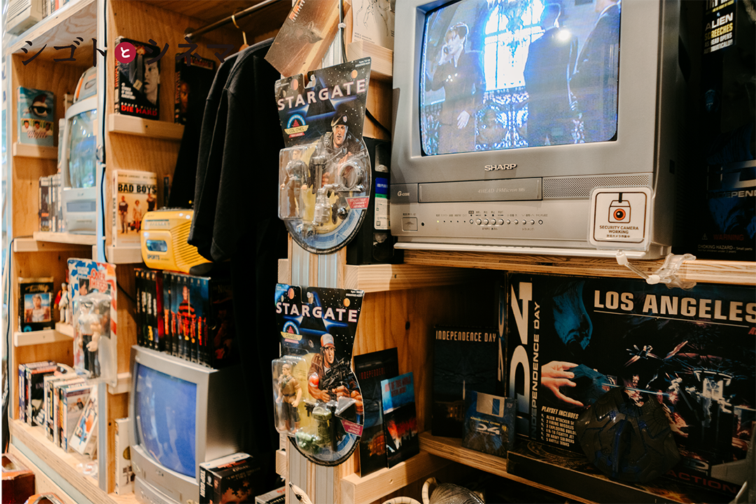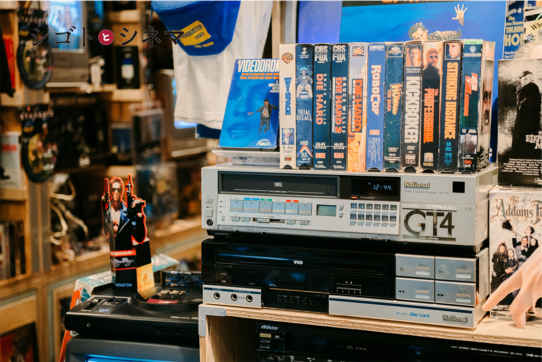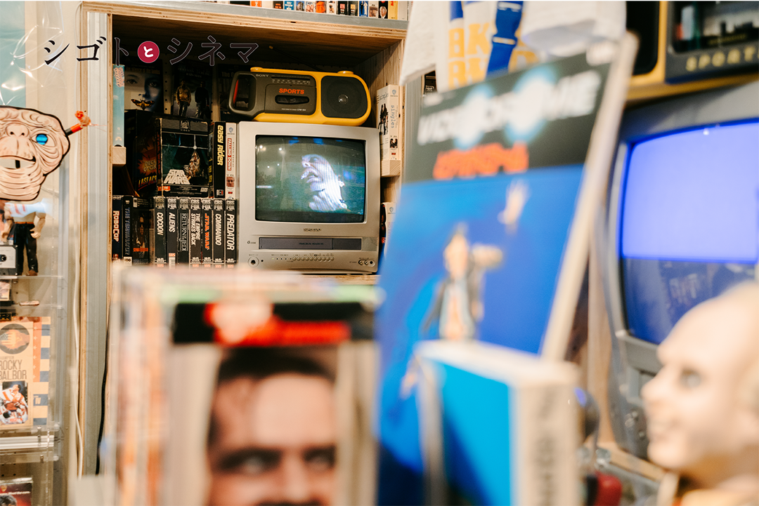 輸入版VHSの販売がきっかけですね。ある時「テレビデオ」を入手してお店でVHSを流しはじめました。最初はブラウン管テレビでスーパーファミコンを流してたんですけど、単純に映画が好きだから輸入版を流していて。今では大小10台のテレビでVHSを流してます笑。